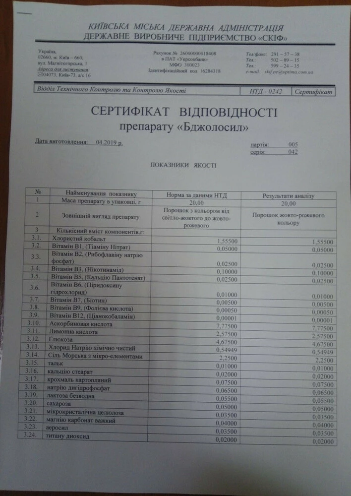 До складу препарату входять: кобальт, глюкоза, аскорбінова кислота і вітаміни. Вітаміни надають стимулюючу дію на ріст, розвиток і продуктивність сімей бджіл, посилюють розплід, підвищуючи їх резистентність до несприятливих факторів зовнішнього середовища. яйцекладку матки.