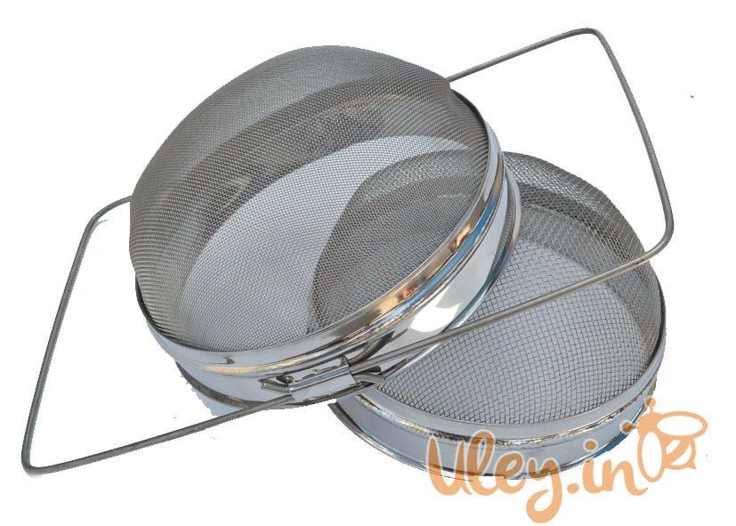 Фільтр (сито) для меду D-200 мм нержавіючої двосекційний випуклий - призначений для очищення меду від шматочків воску і інших твердих частинок під час його зливу з бака медогонки в бідони або в іншу тару. У комплект фільтра входять дві секції з великої і дрібної осередком сітки. Нижня підтримуюча секція має опорну розсувну рамку.