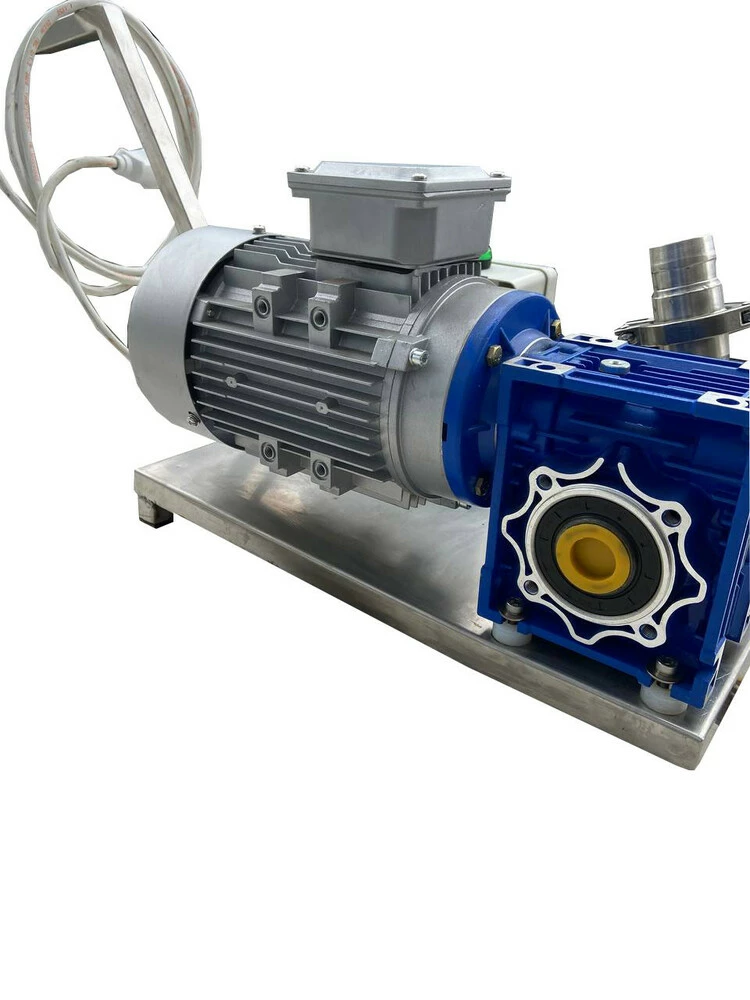 Насос для перекачування меду має також блок живлення та управління оборотами електродвигуна (продуктивністю насоса). Все встановлено на металевому кріслі з колесами та транспортною ручкою.